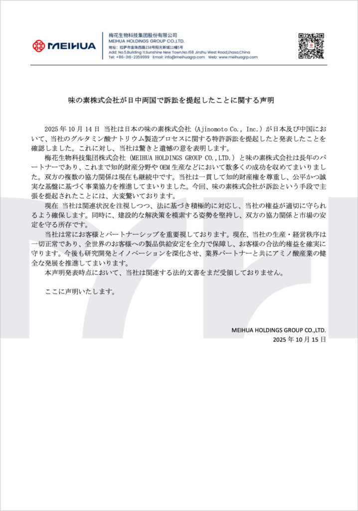 10月14日に味の素株式会社より梅花集団と弊社に対して、グルタミン酸ナトリウムの製造特許を侵害したとの見解のより訴訟を提訴するとのプレスリリースが発出されました。本件につきまして梅花集団より下記の声明が発生されましたので取り急ぎご報告申し上げます。